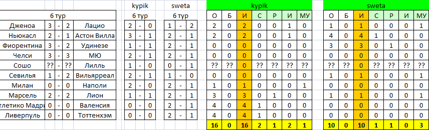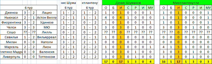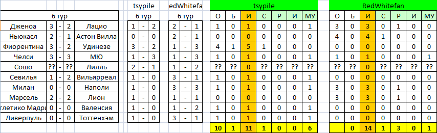 №4: Volynyaka. Отлично игравшему в прошлых Первенствах и занимавших всегда места как минимум у пьедестала, теперь уже отказывает и удача: стабильно забивая в прошедшие туры по 9 голов, зацепил лишь ничью, а в проигрышном матче, где так был уверен в успехе, едва взглянув на список прогнозных матчей, уступил всего один гол. Из подобных кирпичиков «чуть-чуть» и складывается успех или неудача. Пока получается лишь второе.