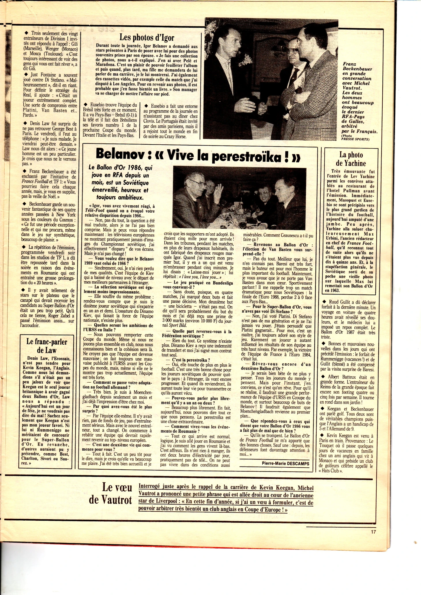 Сегодня просматривал материалы по французскому футболу и наткнулся на интервью Игоря Беланова французскому футбольному изданию France Football от 26 декабря 1989. Заставил улыбнуться сам заголовок интервью, где сочеталась патетика французского языка (Vive la....сразу же всплывают времена Французской революции :-) ) и Перестройка.
