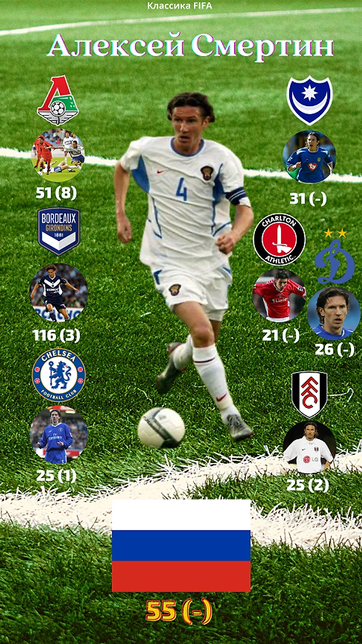 Опорный полузащитник – Алексей Смертин. Родился в Барнауле, воспитанник местного «Динамо». Больше всего игр провел в первой лиге России, за «Зарю» из Ленинска-Кузнецкого (Кемеровская область). Также играл за элистинский «Уралан», московский «Локомотив», московское «Динамо», французский «Бордо» и английские «Челси», «Портсмут», «Чарльтон» и «Фулхэм». Обладатель кубка России с «Локомотивом», чемпион Англии с «Челси». Принял участие в 2 Чемпионатах Европы и одном Чемпионате мира. За сборную России провел 55 матчей.
