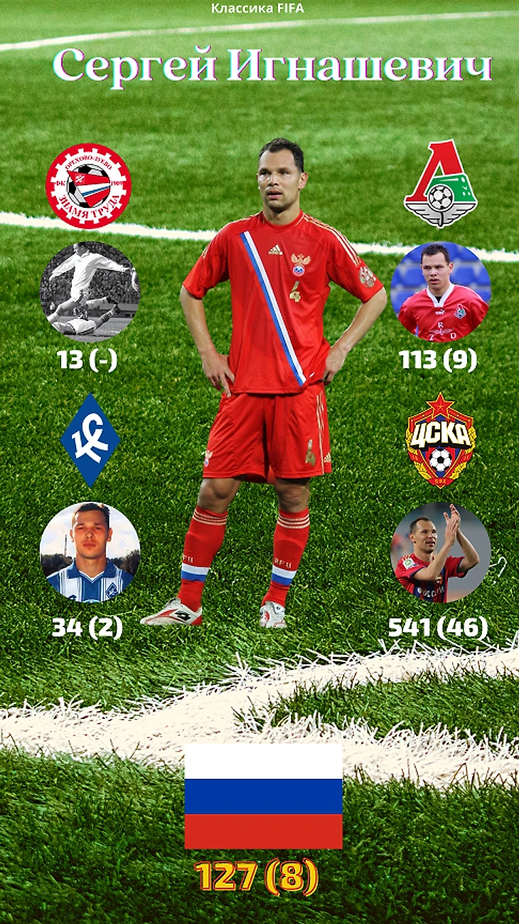 Центральный защитник – Сергей Игнашевич. Родился в Москве, воспитанник школы «Торпедо». На взрослом уровне дебютировал в клубе «Знамя труда» из Орехово-Зуево, в высшей лиге – за самарские «Крылья Советов». Играл также за московский «Локомотив», но основную часть карьеры провел в ЦСКА. 6-кратный чемпион России (5 раз с ЦСКА, 1 – с «Локомотивом»), 7-кратный обладатель кубка России (6 раз с ЦСКА, 1 – с «Локомотивом»), 7-кратный обладатель суперкубка России (6 раз с ЦСКА, 1 – с «Локомотивом»), выиграл Кубок УЕФА в 2005 году с ЦСКА. Принимал участие в 3 Чемпионатах Европы и 2 Чемпионатах мира, вместе со сборной России занял 3 место на Евро-2008.Рекордсмен по числу игр в еврокубках среди всех россиян. Занимает первое место по числу игр за сборную России – в 127 матчах забил 8 голов.