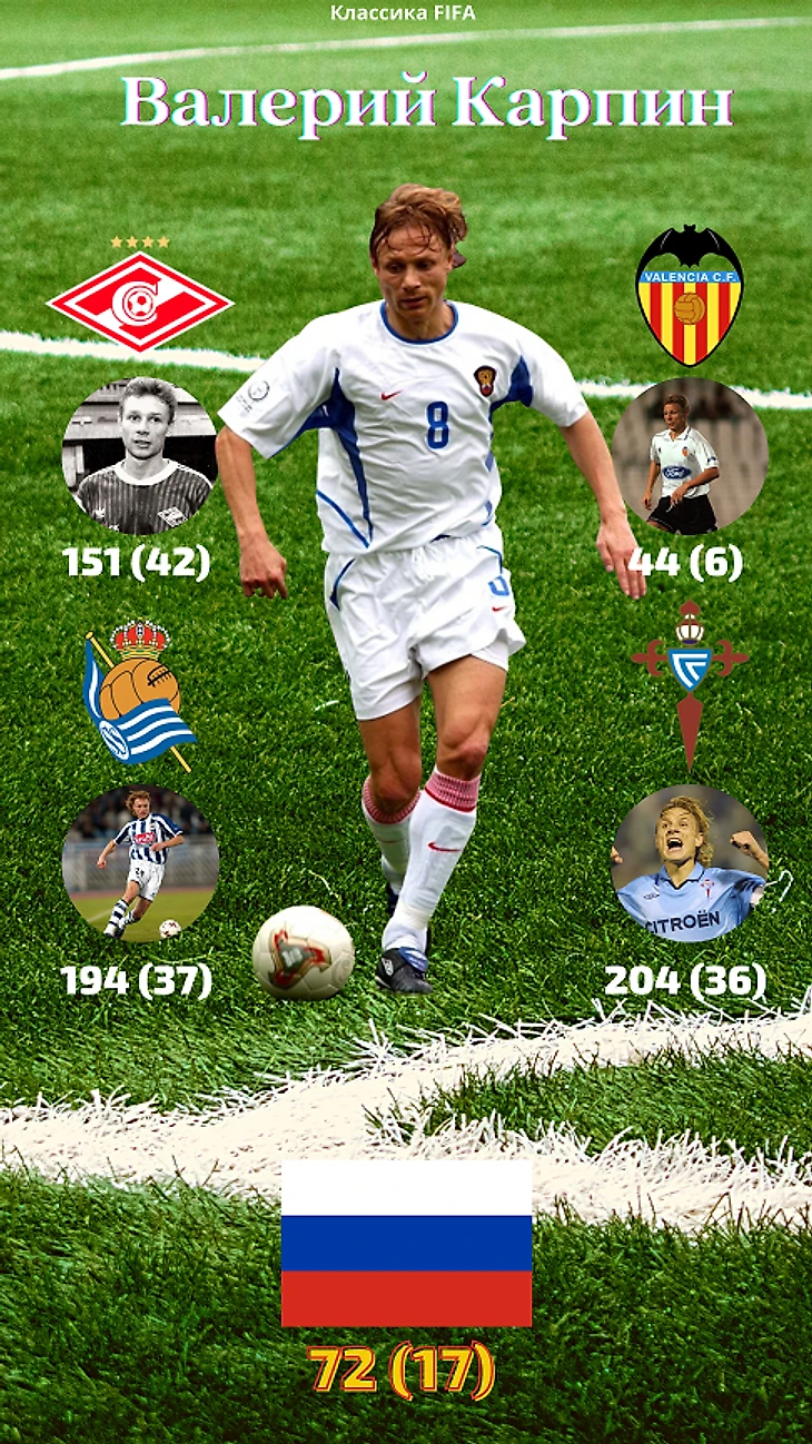 Правый полузащитник – Валерий Карпин. Родился в Нарве, на территории нынешней Эстонии. На юношеском уровне играл за таллинские клубы «Спорт» и «Звезда», дубль ЦСКА, на взрослом – за воронежский «Факел», московский «Спартак» и ряд испанских клубов, среди которых «Реал Сосьедад», «Валенсия» и «Сельта». Больше всего игр провел за клубы из Виго и Сан-Себастьяна, а также за «красно-белых». 3-кратный чемпион России, обладатель кубков СССР и России в составе «Спартака», обладатель Кубка Интертото 2000 года с «Сельтой». За сборную России провел 72 матча, забил 17 голов.