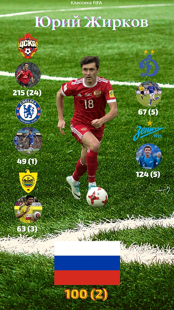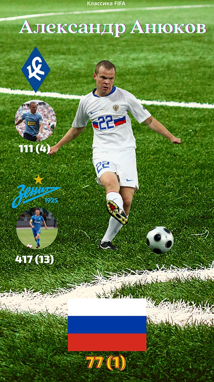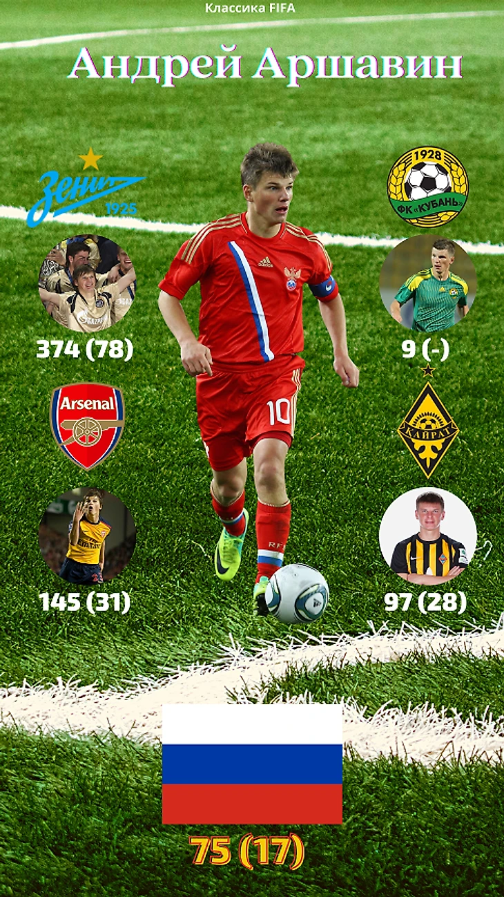 Оттянутый форвард – Андрей Аршавин. Родился в Санкт-Петербурге, воспитанник местной «Смены». Больше всего матчей провел за свой первый взрослый клуб – «Зенит». Также играл за лондонский «Арсенал», краснодарскую «Кубань» и казахстанский «Кайрат». 3-кратный чемпион России, обладатель суперкубка России, выиграл Кубок УЕФА и Суперкубок Европы в 2008 году – всего этого достиг с «Зенитом». Дважды выигрывал кубок Казахстана с «Кайратом». Лучший ассистент в истории «Зенита», в 2008 году занял 6 место в голосовании за «Золотой мяч», это лучший результат для россиянина после распада СССР. Участник 2 Чемпионатов Европы, вместе со сборной России занял 3 место на Евро-2008. За сборную России провел 75 матчей, забил 17 голов.