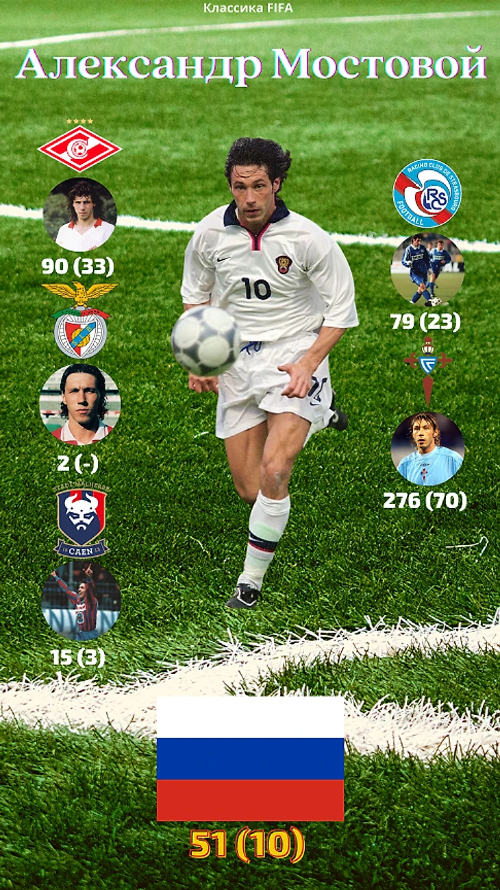 Атакующий полузащитник – Александр Мостовой. Родился в г. Ломоносов Ленинградской области. Воспитанник школы ЦСКА. Транзитом через «Красную Пресню» (другое название клуба – «Асмарал») попал в московский «Спартак». Также играл за лиссабонскую «Бенфику», французские «Кан» и «Страсбург», испанские «Алавес» и «Сельту». Больше всего игр провел в клубе из Виго. 2-кратный чемпион СССР со «Спартаком», обладатель кубка Португалии с «Бенфикой», 2-кратный обладатель Кубка Интертото – в 1995 году со «Страсбургом» и в 2000 году с «Сельтой». Участвовал в 2 Чемпионатах Европы и 2 Чемпионатах мира. За сборную России провел 51 матч, забил 10 голов.