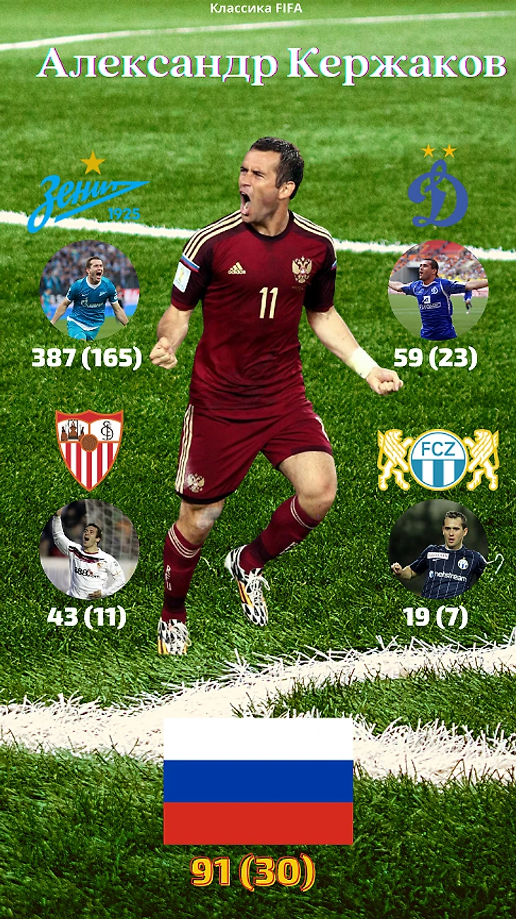 Центральный нападающий – Александр Кержаков. Родился в г. Кингисепп Ленинградской области. Воспитанник школы «Зенита», больше всего матчей в карьере провел за родной клуб. Также играл за светогорский «Светогорец», московское «Динамо», испанскую «Севилью» и швейцарский «Цюрих». 3-кратный чемпион России, обладатель кубка и суперкубка России с «Зенитом», обладатель кубка и суперкубка Испании, а также Кубка УЕФА в сезоне 2006/07 с «Севильей», обладатель кубка Швейцарии с «Цюрихом». Лучший бомбардир в истории «Зенита». Лучший бомбардир в еврокубках среди россиян. Принимал участие в 2 Чемпионатах Европы и 2 Чемпионатах мира. Лучший бомбардир в истории сборной России – в 91 игре забил 30 голов.