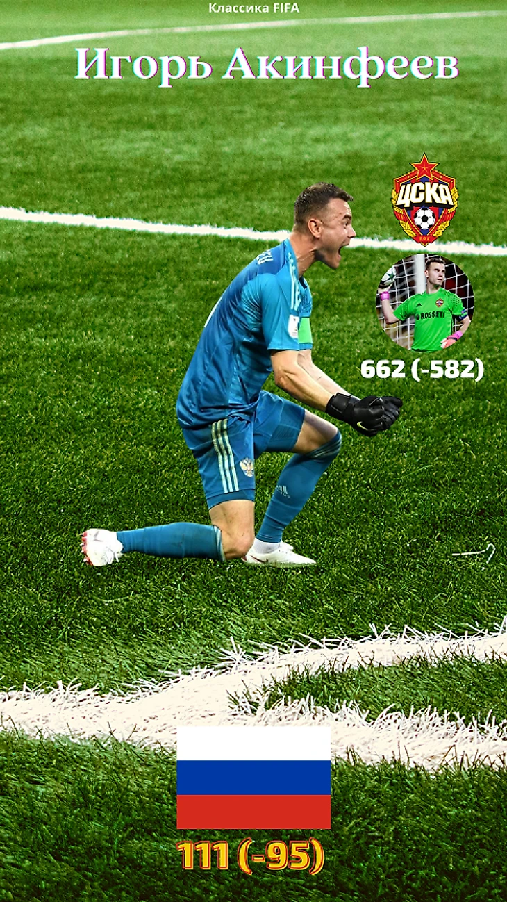 Вратарь – Игорь Акинфеев. Родился в Видном, Московской области. Воспитанник московского ЦСКА, всю жизнь играет за родной клуб. 6-кратный чемпион России, 6-кратный обладатель кубка России, 7-кратный обладатель суперкубка России, выиграл Кубок УЕФА в 2005 году. Занимает первое место по количеству матчей среди всех вратарей в России и странах бывшего СССР. Занимает первое место по количеству игр за ЦСКА за всю историю. Принимал участие в 4 Чемпионатах Европы и 2 Чемпионатах мира, вместе со сборной России занял 3 место на Евро-2008. Занимает второе место среди всех россиян по количеству игр в еврокубках. За сборную России провел 111 матчей, занимает второе место по этому показателю.