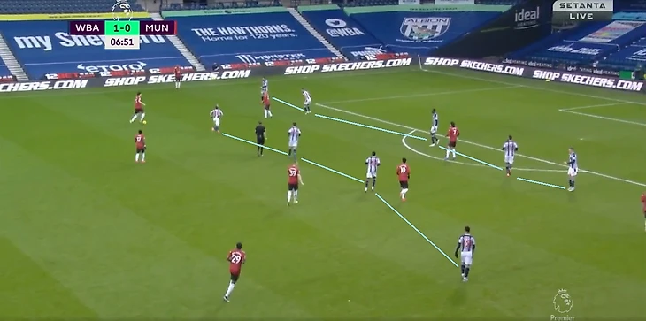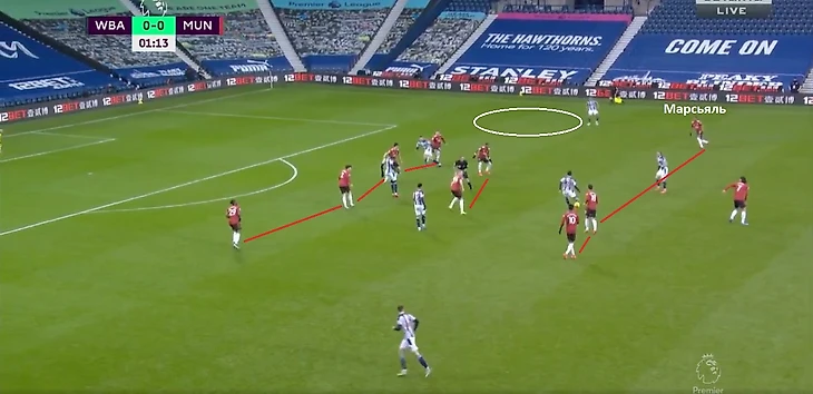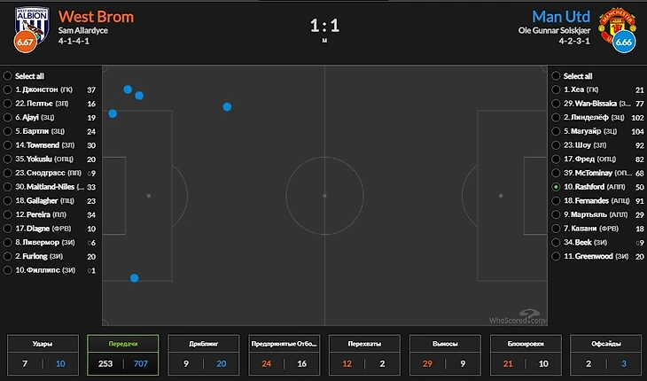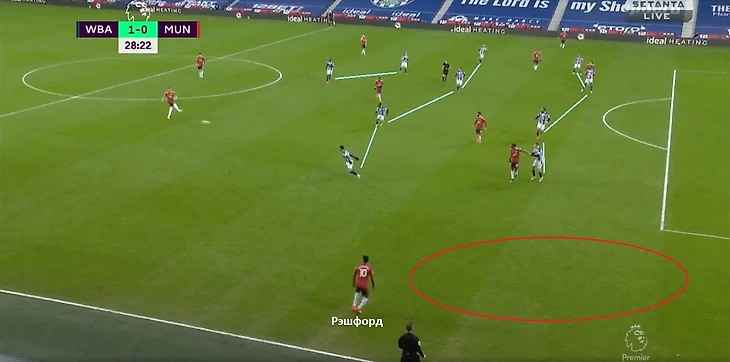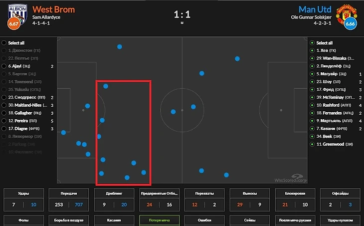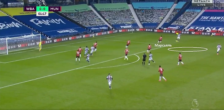 Однако в фазе обороны «Вест Бромвич» ситуативно перестраивался в 4-4-2, вследствие того, что один из игроков линии полузащиты поднимался выше в пару к нападающему. В таком случае на фланге для Рэшфорда (либо для Ван-Биссаки, если он создавал ширину атаки, а Маркус располагался в полуфланге) становилось немного свободнее и при доставке мяча ему была возможность делать заброс в штрафную площадь. За 90 минут игрового времени он сделал пять забросов, но ни один не достиг своей цели. У Аарона шесть забросов, но также ни одного точного. Тем не менее, голевая передача пришла как раз с фланга, а именно, благодаря забросу от Люка Шоу с левого края поля вблизи штрафной площади соперника.