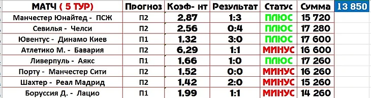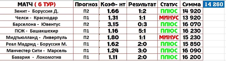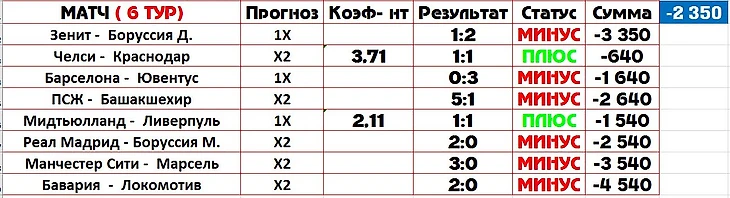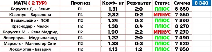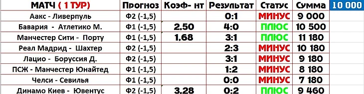 Да, по такой стратегии мы поймали дважды Реал Мадрид, отчасти Баварию, и других наших фаворитов, но просто гляньте на банк, не самое приятное зрелище. Другое дело просто исходы, а еще лучше победы с форами. На этом все. Надеемся что чем - то смогли вам помочь и сделать возможно следующий групповой этап Лиги Чемпионов для вас более прибыльным.