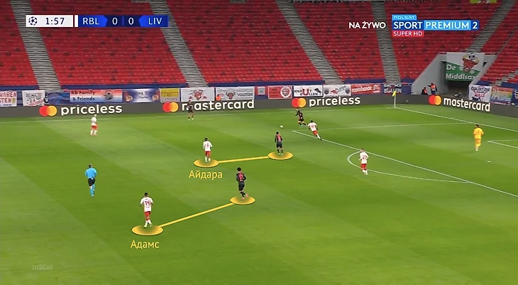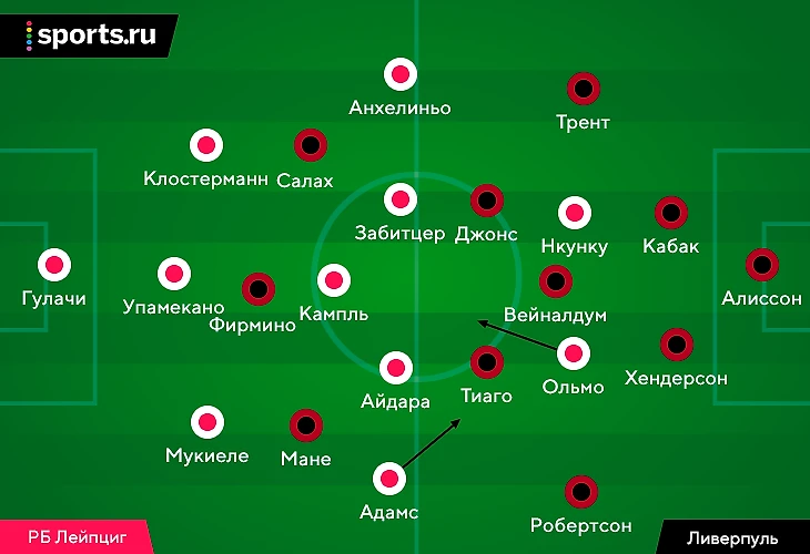 Фишка «Лейпцига» в прессинге – команда оставляла свободным крайнего защитника «Ливерпуля» на дальнем фланге. Это интересным образом преобразовывало роль Адамса. По схемам он был правым латералем, но если «Лейпциг» давил на левом краю, то становился дополнительным полузащитником и уравнивал ситуацию в центре поля. Тогда к Вейналдуму мог подняться Амаду Айдара:
