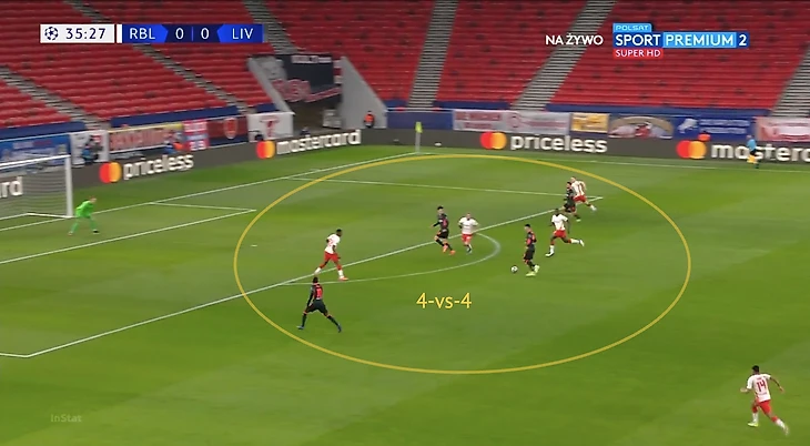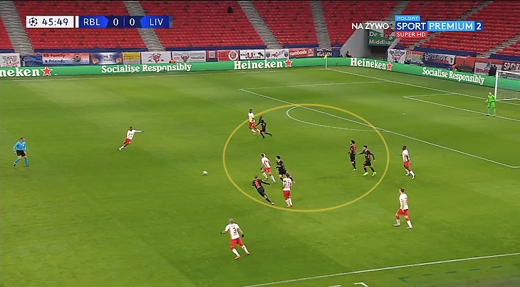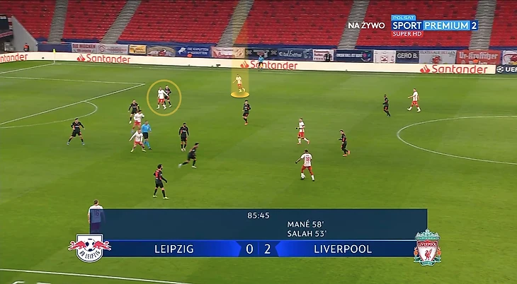 Выше уже написал, что защитники «Лейпцига» высоко встречали нападающих «Ливерпуля», если гости проходили прессинг через вертикальный пас. У этого были как положительные результаты, так и отрицательные.