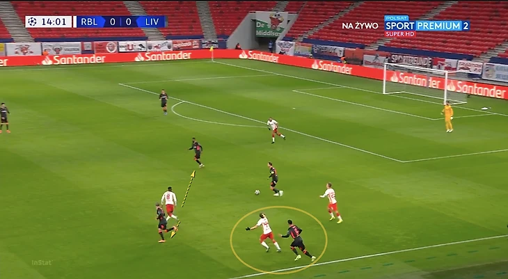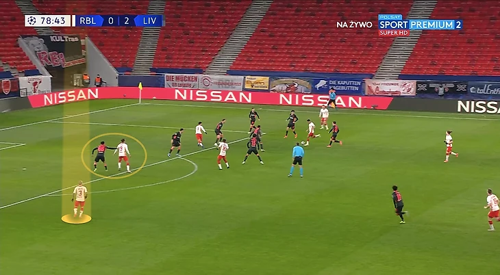 Важным дополнением к прессингу «Лейпцига» была агрессивная манера центральных защитников. Если «Ливерпуль» пытался выйти через длинные передачи на нападающих, Мукиеле, Упамекано и Клостерманн выдвигались и поджимали их. Атака, которая завершилась попаданием Ольмо в штангу, началась как раз с перехвата Мукиеле.