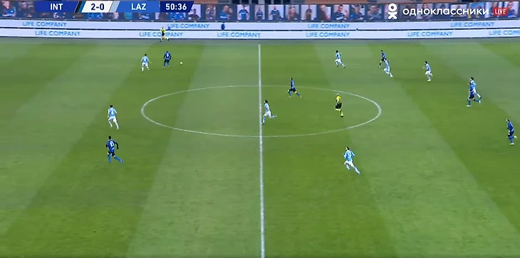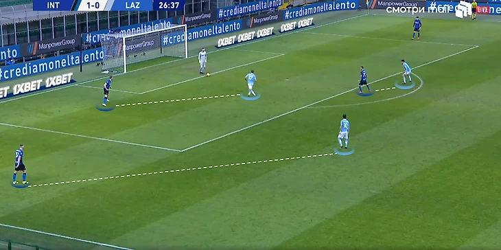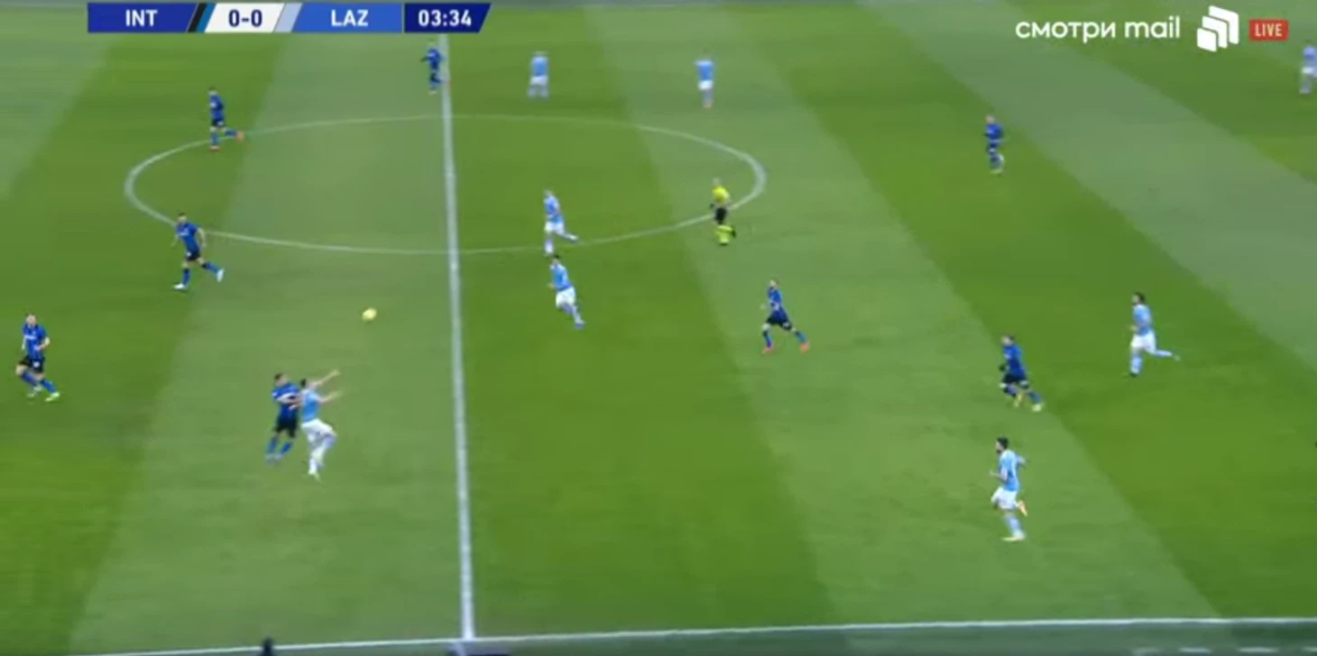 Первая проблема, с которой столкнулся «Лацио», — расположение центральных защитников при таких лонгболлах: всегда 3-4 человека занимали более осторожные позиции, «Интер» готов был дать возможность сопернику принять мяч перед линией, лишь бы избежать забросов за спину.