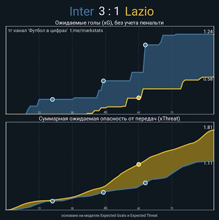 О таком распределении атак, как у «Интера», «Лацио» наверняка и мечтал: минимум длительных владений, все основные моменты выжаты из быстрых атак. И важно сказать, что такой сценарий не требует какой-то грандиозной адаптации от игроков — Барелла, Лукаку, Перишич особенно хороши в тех матчах, когда у «Интера» есть достаточно пространства для того, чтобы протащить мяч/забросить за спину. В ситуациях, когда соперник весь матч сидит в низком блоке, у того же Бареллы могут начаться сложности.