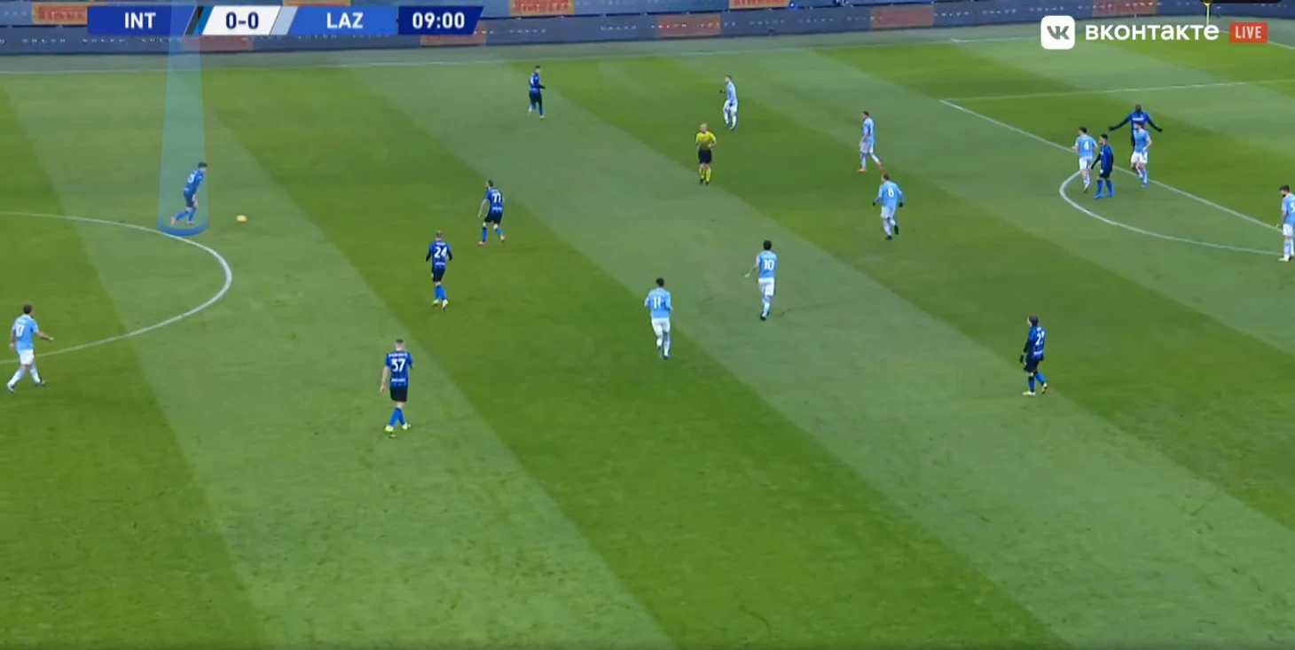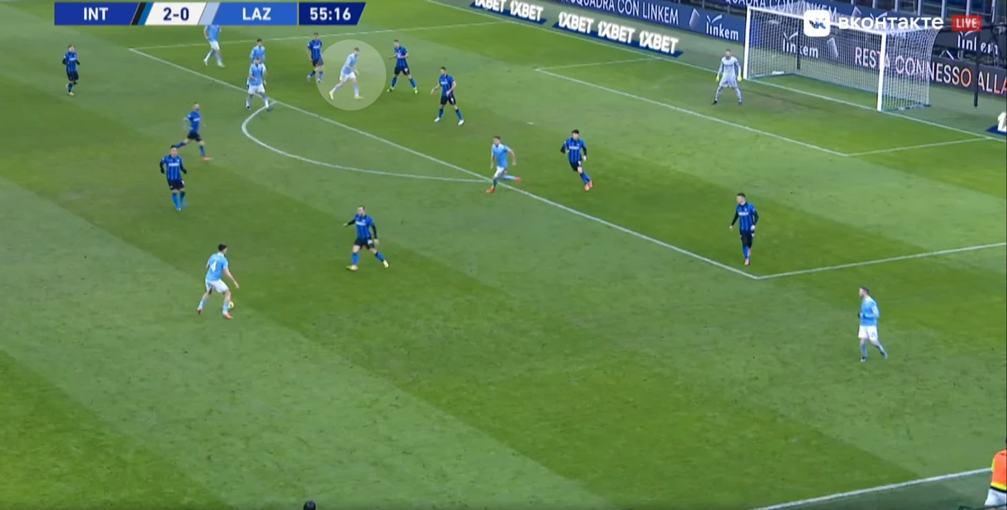 Во втором тайме Лаутаро и — что особенно важно и для «Лацио» плохо — Лукаку получали неприлично много пространства впереди. Голевая атака тоже возникла из ситуации 2v2/2v3 и продлилась всего лишь 11 секунд.