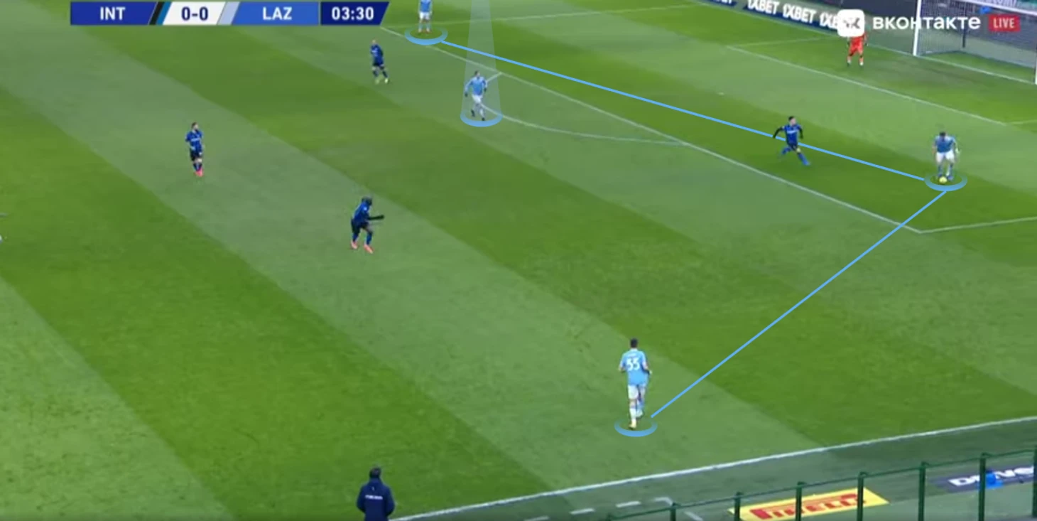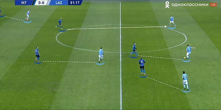 «Интер» тоже подготовил билдап под соперника — основной фишкой стала высокая позиция Шкриньяра и последующее продвижение словака с мячом по флангу. В итоге, у него четвёртое место в команде по всей дистанции carries (продвижений мяча более чем пять метров), а также их дистанции, он же — лидер команды по числу касаний мяча во второй трети. «Лацио», как мы видим, для прессинга отправлял четвёрку из двух нападающих и восьмёрок, причём Альберто и Милинкович-Савич действовали по крайним игрокам (в данной ситуации — по крайним центральным защитникам).