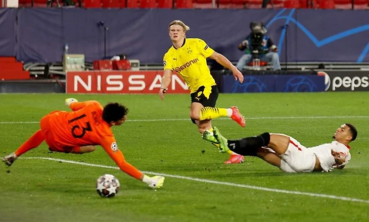 «Севилья» продолжала пропускать быстрые атаки дортмундцев. На 34-й минуте Дауд вывел Холанда на ударную позицию, но Буну парировал пушечный выстрел норвежца с линии штрафной. А спустя минуту никем не прикрытый Матс Хуммельс с 12 метров пробил выше ворот после подачи углового Санчо с правого фланга. На 43-й минуте Ройс в центре поля обокрал соперника и спустя несколько секунд после выхода три в один вывел на удар Холанда, который хладнокровно пробил мимо голкипера. 1-3. Это был 18-й гол норвежца в 13-ти матчах Лиги Чемпионов! Очередной рекорд!