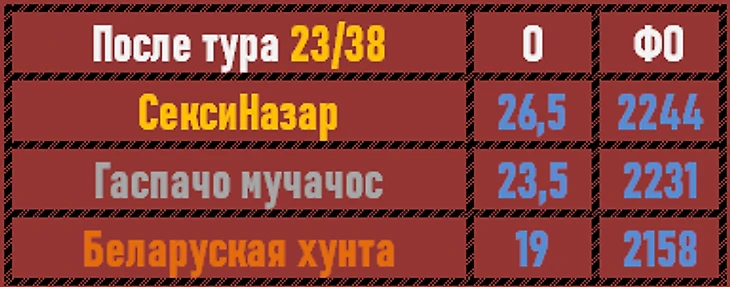 Убедительная победа СексиНазара - просто без вариантов. Руслан в очередной раз показал сверхубедительную игру! ГМ и БХ зарубились не на шутку, в итоге победу на волоске одержали Гаспачо мучачос.