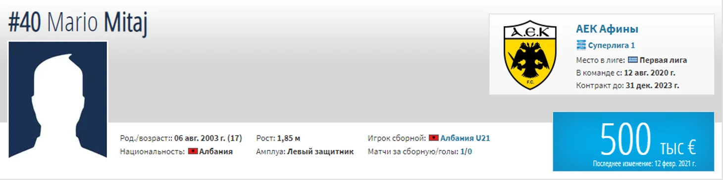 Марио очень молод, и ему сейчас только 17 лет. Он уже привлекается к играм основы АЕКа, но пока ему сложно стать основным футболистом на позиции левого защитника. В ноябре 2020 года он дебютировал за молодёжную сборную Албании, и уже успел провести за неё 2 матча. В АЕКе явно рассчитывают на него, так как у него ещё 3 года по контракту с клубом. Из сильных качеств отметим игру головой, ловкость, командную работу, прыгучесть и отбор.