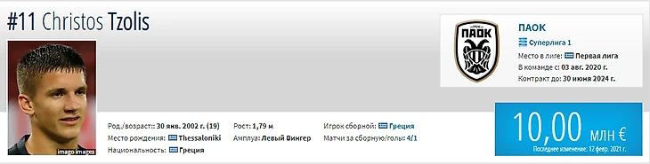 По футболисту, кто займёт первое место у меня не было никаких сомнений. Этим футболистом стал Христос Цолис. Сайт transfermarkt оценивает его в 10.000.000 евро и он самый дорогой футболист своего клуба ПАОК, и второй по стоимости футболист всей греческой лиги (выше только Камара из Олимпиакоса). Парень очень много играет в этом сезоне за ПАОК, так как принял участие во всех 22-х матчах греческой лиги и набрал в них 10 баллов (5+5). Главное спортивное медиа Франции L’Equipe включило Христоса в свой топ-50 самых талантливых футболистов мира родившихся после 1 января 2002 года. Расположив его там на 37-м месте.