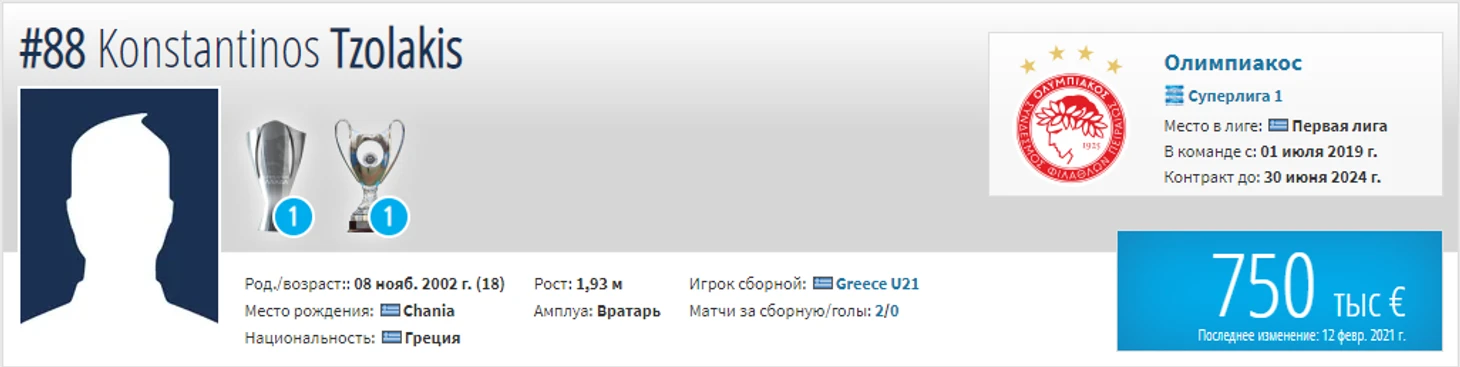 На четвёртое место поставим второго голкипера сильнейшего клуба Греции Олимпиакоса. Вторым номером Олимпиакоса я считаю Цолакиса, хотя исландец Кристинссон и попадал чаще в запас, но на поле он так и не выходил в отличии от Константиноса. В октябре 2020 дебютировал в воротах молодёжной сборной Греции в возрасте 17 лет и 10 месяцев. Из сильных сторон отметим игру ногами, рефлексы, прыгучесть и ввод мяча в игру.