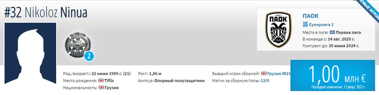 На третье место поставим опорного полузащитника из клуба ПАОК. Клуб из Греции летом 2020 года заплатил за трансфер Ники из тбилиского Динамо 850.000 евро. Да, в ПАОКе он пока редко выходил на поле, но думаю со временем он может получать больше игровых минут. Выступая ещё в чемпионате Грузии футболист забил просто великолепный мяч. Помимо опорного, он может сыграть и при необходимости играет и центрального. Из сильных качеств выделим физические данные, отбор, выносливость, игру головой и в Грузии он просто великолепно исполнял штрафные удары.