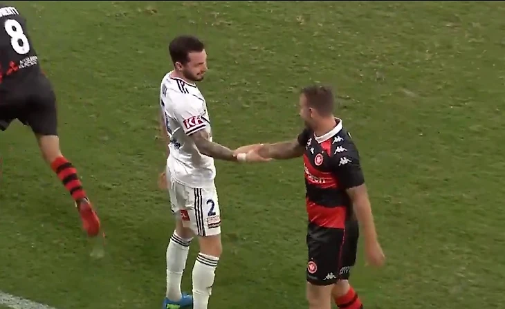 В австралийской футбольной лиге, в матче между "Вестерн Сидней" и "Мельбурн Виктори" (2:0), произошел забавный эпизод: двое игроков соперничающих команд боролись за мяч и в какой-то момент, форвард хозяев Кокс схватил за руку защитника "Виктори" Ру.