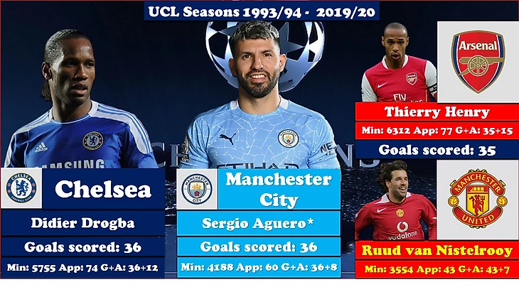 Лига чемпионов УЕФА: Лучшие бомбардиры клубов АПЛ (1993/94-2019/20)