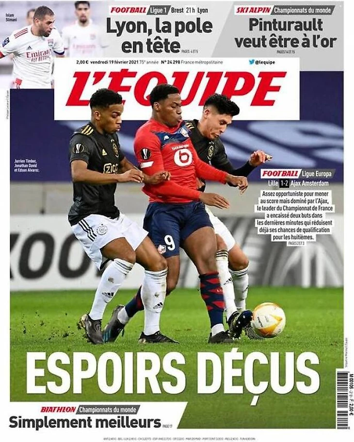 Главным по неожиданной развязке стал матч в Лилле. Местный «доги» принимали амстердамский «Аякс» и даже забили первыми, хотя играли крайне слабо и лишь за счёт везения вели в счëте большую часть матча. Однако, за 3 минуты до конца основного времени, «Аякс» сумел всё перевернуть, забив два мяча. «L'Equip» серьезно критикует как отдельных игроков «Лилля», так и всю команду в целом. «Они были как потерянные дети» - заявляет автор статьи - «не могли сделать больше 3 подряд точных передач». Футбольная общественность Франции явно разочарована игрой «Лилля» и считает, что клуб уже закончил выступление в этом турнире, но, все-таки, призывает проявить характер и сыграть хотя бы не «спустя рукава» в ответном матче. Постараться для своих болельщиков.