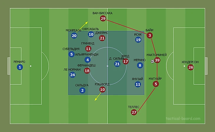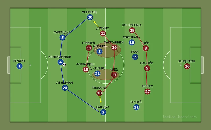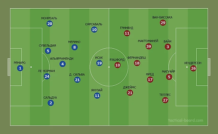 Номинальные хозяева вышли в базовой структуре 4-3-3. В высокой степени креативным получился центр поля, где треугольник сформировали Ильярраменди, Мерино и Давид Сильва. Александр Исак был единственным центральным нападающим, Янузай и Оярсабаль заняли позиции вингеров. Норвежский наставник гостей выбрал базовую 4-2-3-1, в которой над парой опорников Фред – МакТоминей располагался Бруну Фернандеш. Состав атакующей тройки заполнили Джеймс, Рэшфорд и Гринвуд.