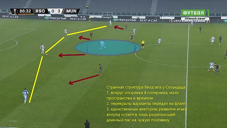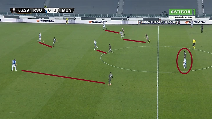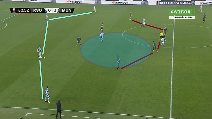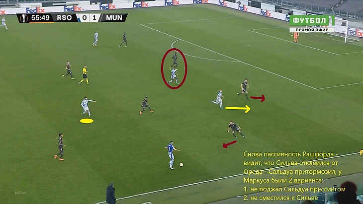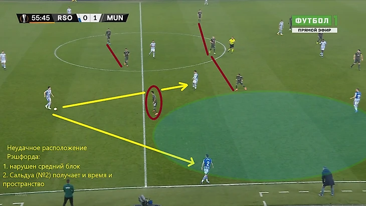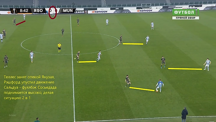 На этом скриншоте видно, что МЮ включает персональный прессинг, однако самое интересное на дальнем фланге – пока Рэшфорд увлечен ситуацией в зоне мяча, у него за спиной поднимается выше Сальдуа. Фуллбэк Сосьедада таким образом создавал ситуацию 2 в 1, ведь Янузай уже привязал к себе Теллеса. Таким образом, в случае успешной циркуляции мяча с фланга на другой либо в случае успешной вертикальной атаки, испанцы получили бы преимущество на правом краю.