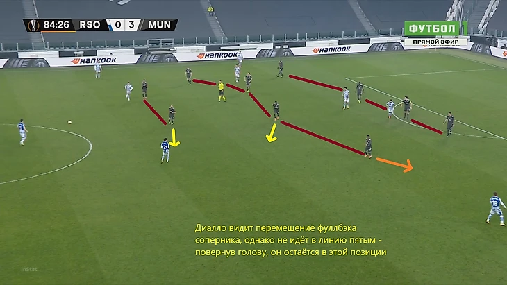 Проблемы МЮ в оборонительной структуре на позиции левого полузащитника продолжались и после выхода Диалло. Молодой талант гостей держался в среднем блоке, стараясь не рушить цельность построения, однако, своевременность выдёргивания из него только улучшила бы положение дел. На скриншоте выше один из таких примеров – Диалло увидел, что вектор атаки Реала поворачивается на его фланг, быстро просканировал пространство, повернув голову налево. Логичным ходом было бы смещение к Теллесу – сформировать пятёрку в линии защиты, закрыв вариант паса на фуллбэка.