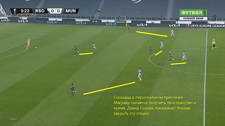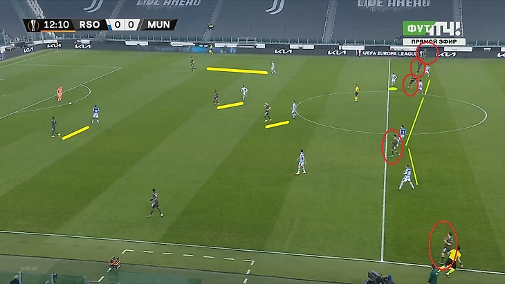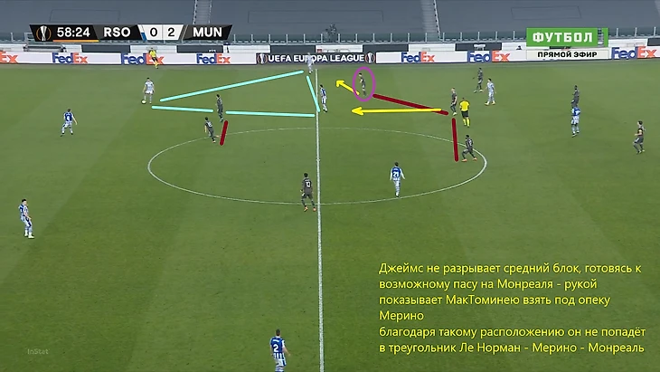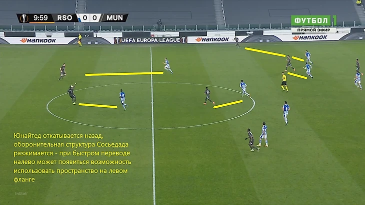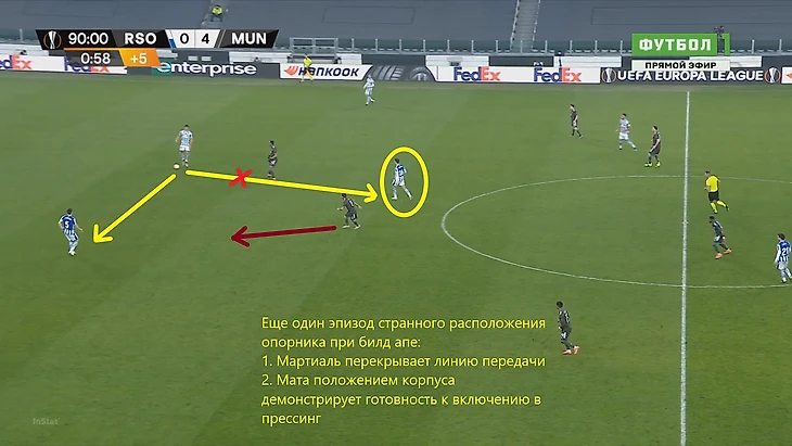Скриншот демонстрирует типичную ситуацию провала прессинга хозяев – игроки МЮ заполнили фланги, а также выдёргиваются ниже, предлагая себя для получения мяча. Две группы игроков Сосьедада разделены, в центре есть пространство и время для развития атаки. Теллес и Гринвуд открыты на обоих флангах, формируя возможность вывести атаку вперед через любой из них.