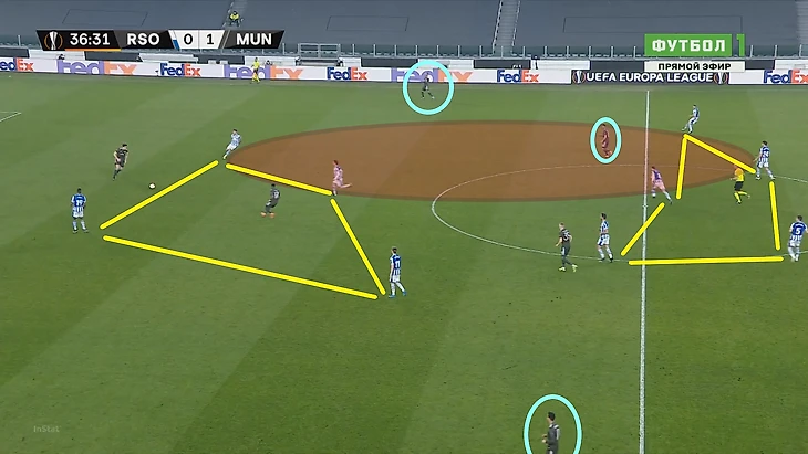 Реал Сосьедад аналогично сопернику использовал высокий прессинг, персонально поджимая оппонентов. МЮ эпизодами пытался формировать тройку в первой линии, формируя ширину за счёт высоких позиций Теллеса и Джеймса. Испанцы пробовали давить эту структуру, вынуждая игроков МЮ приближаться к собственным воротам – это лишало англичан достаточного количества времени для принятия качественных решений.
