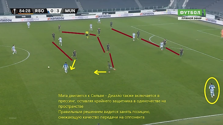 Диалло решил включиться в прессинг, сделав рывок к Давиду Сильве, которого уже накрывал Хуан Мата – оставил фуллбэка Реала абсолютно свободным и на пространстве. Как уже сказано выше, разумнее было бы сформировать пятерку в ближней к воротам линии обороны, либо перекрыть линию паса на адресата, сблизившись с ним.