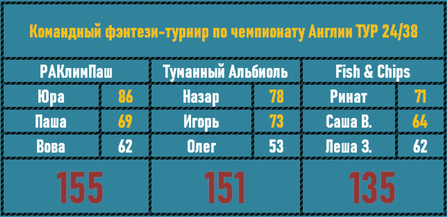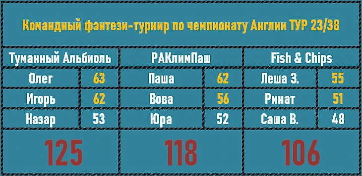 Показав почти одинаковые результаты, Олег и Игорь из Туманного Альбиоля выводят свою команду на первое место в туре. Отставание конкурентов вызвано не очень хорошими результатами Вовы и Юры, а о национальном британском блюде и его представителях и вовсе нечего.