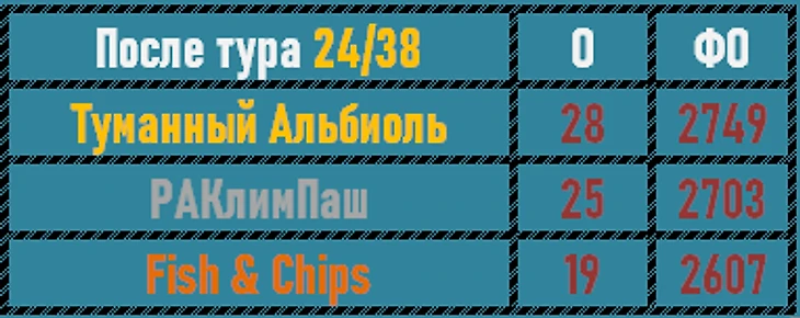 Неприятная серия Fish & Chips рискует продолжится, если парни не соберутся. В этом туре первые две позиции решили поменяться. В лидерах тура - РАКлимПаш, в основном благодаря прекрасной личной игре Юры.