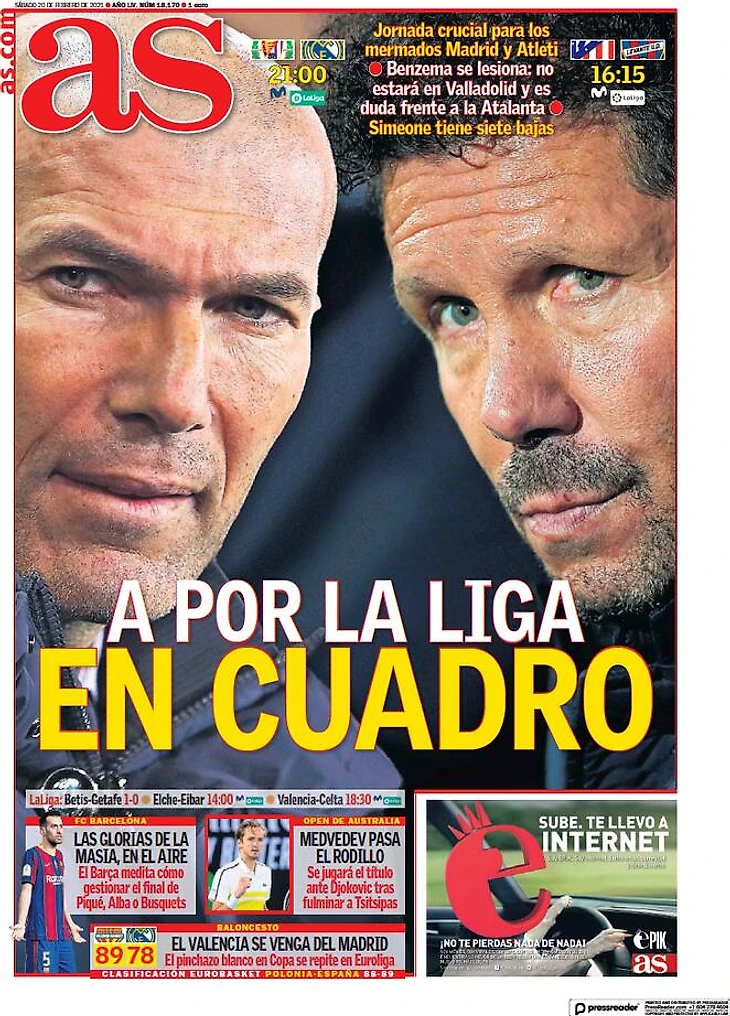 Пока на футбольных полях затишье после жарких матчей еврокубков, слово взяли тренера. В частности, Зинедин Зидан и Диего Симеоне взяли на себя удар испанских журналистов, это событие стало «лицом» сегодняшнего номера «АS»: