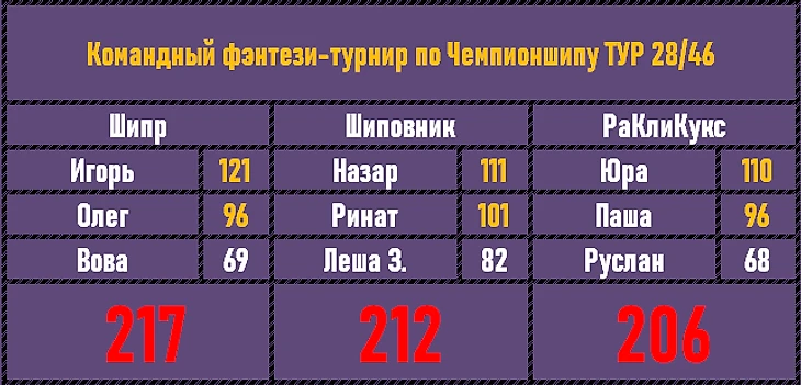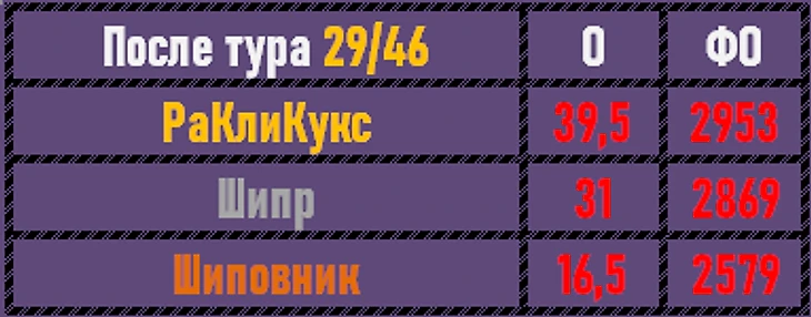 2 тура в нашем обзоре, и на этом отрезке все команды набрали по 2 балла. Если Шипр и РАклиКукс обменялись первым и последним местами, то стабильность Шиповника выходит на новый уровень - теперь это два подряд вторых места! Стратегически РАКлиКукс все ближе к общей победе, но впереди еще 17 туров, может и Шиповник сюрприз преподнесет?