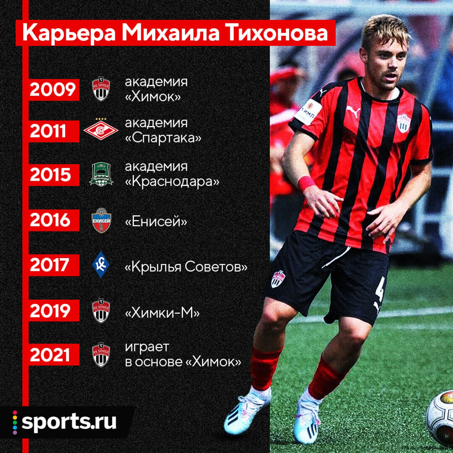 Пятнадцать лет назад «Химки» выходили в Премьер-лигу с Андреем Тихоновым. Теперь играют там с его сыном Михаилом на правом фланге. Тихонов-младший побеждал «Динамо» и «Локомотив» и помогал сдержать ЦСКА. Самостоятельность пришла только сейчас, а вся прошлая карьера Тихонова текла под надзором отца – от академий «Химок», «Спартака» и молодежки «Краснодара» до «Енисея» и «Крыльев Советов».