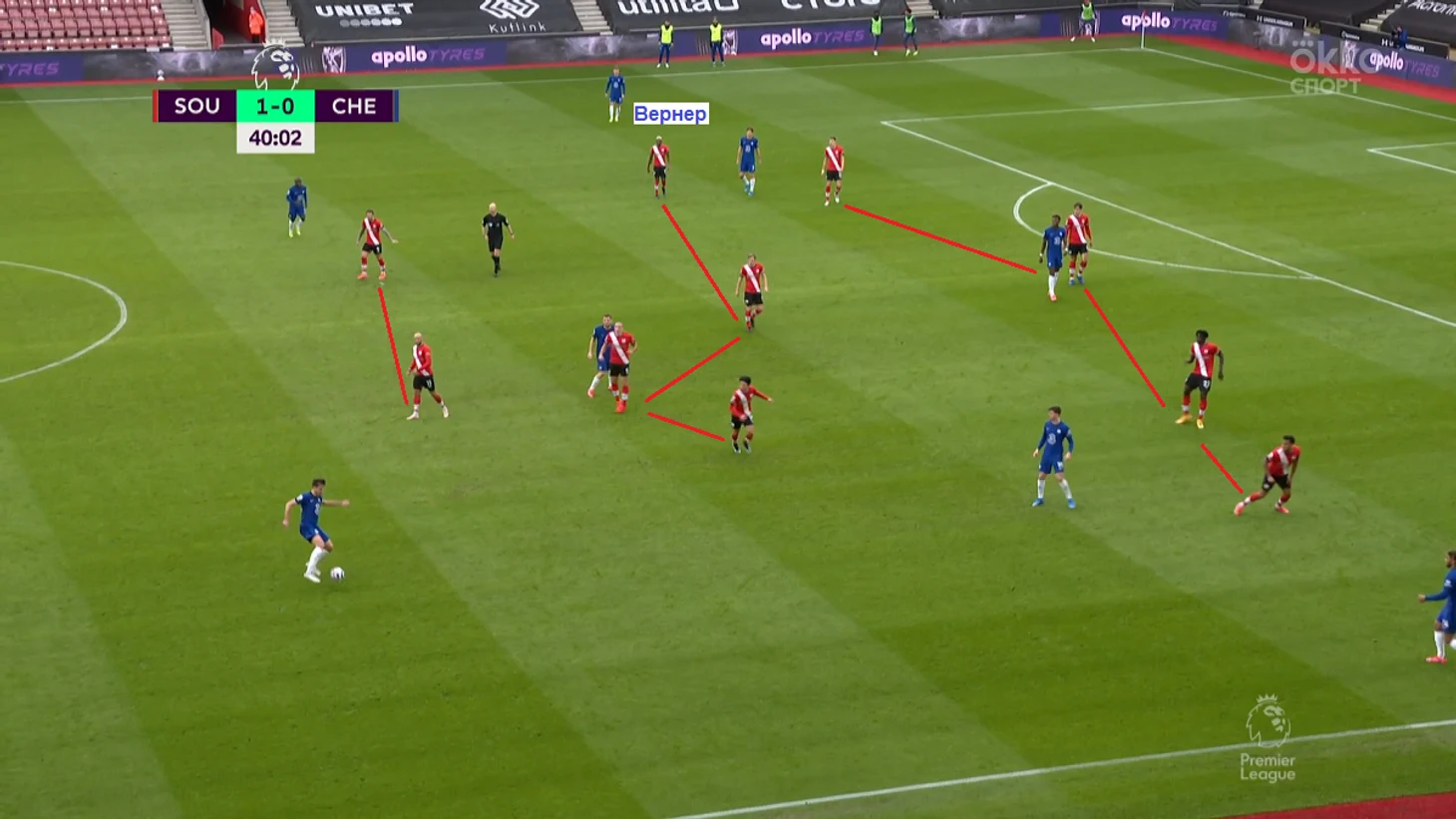 Пример того, как по «Саутгемптону» била линия из четырех защитников. Вернер остается один на левом фланге «Челси»: Беднарек и Дженепо стянулись на Алонсо.
