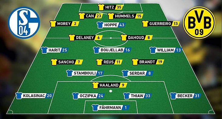 В день игры в Гельзенкирхене стало известно, что из-за разрыва мышечного волокна матч пропустит Мануэль Аканджи, место которого в центре обороны занял Эмре Джан. Удивило появление в стартовом составе Юлиана Брандта, который в этом сезоне выглядит бледной тенью самого себя. Имена остальных игроков «Боруссии» были вполне ожидаемы: Марвин Хитц, Матеу Морей, Матс Хуммельс, Рафаэль Геррейро, Махмуд Дауд, Томас Делейни, Марко Ройс (этот матч стал для него 300-м в Бундеслиге), Джейдон Санчо и Эрлинг Холанд.