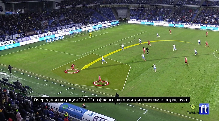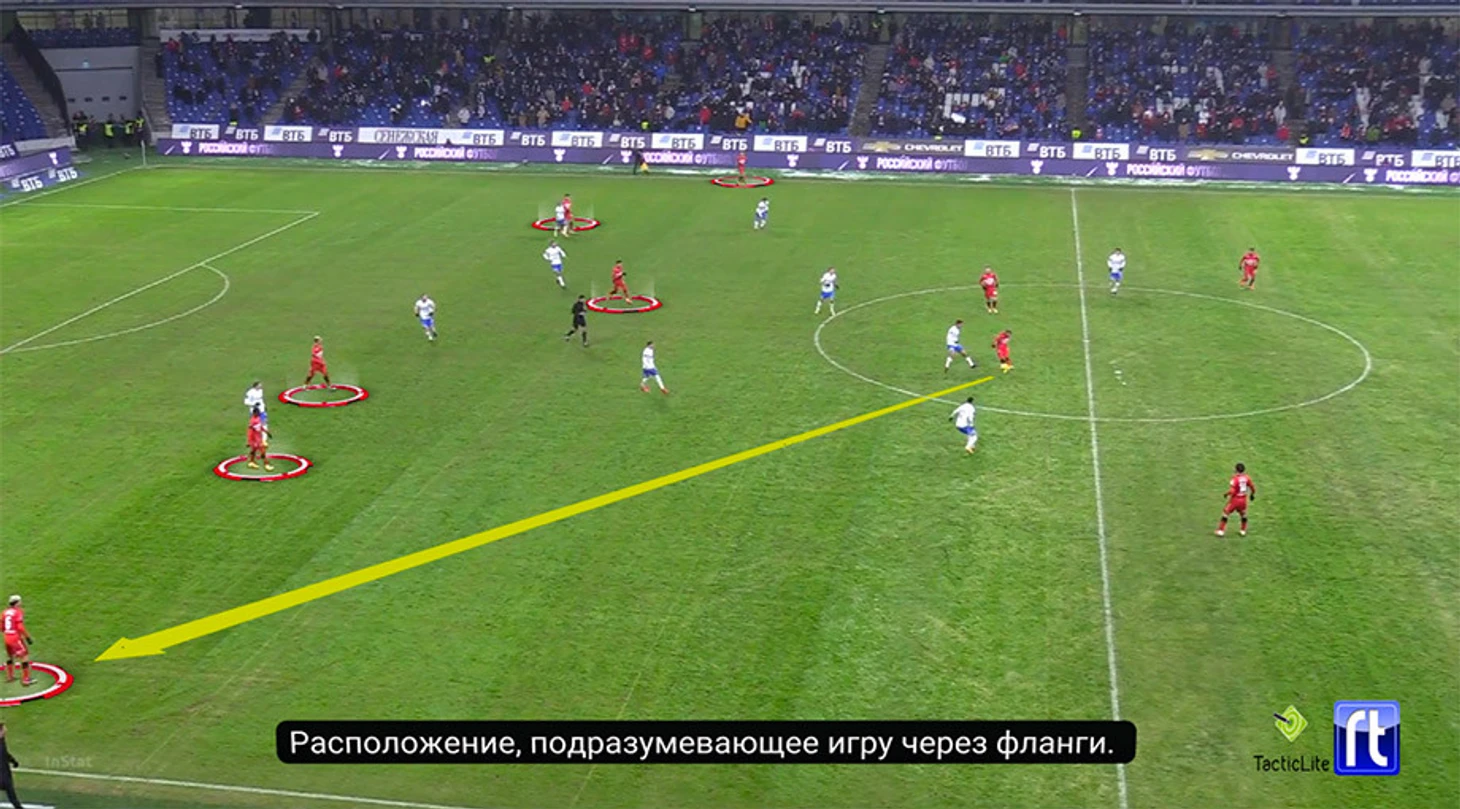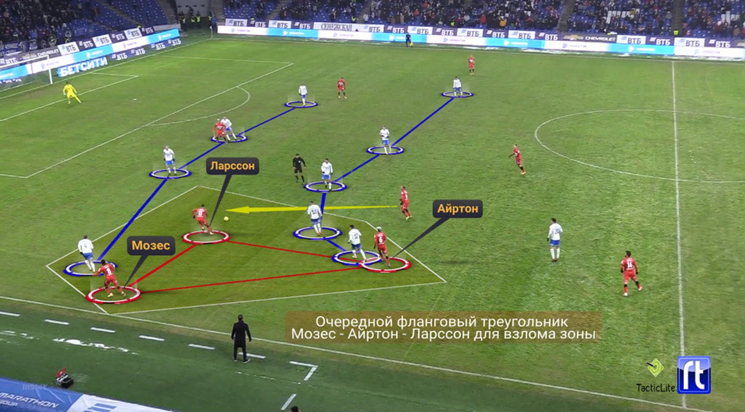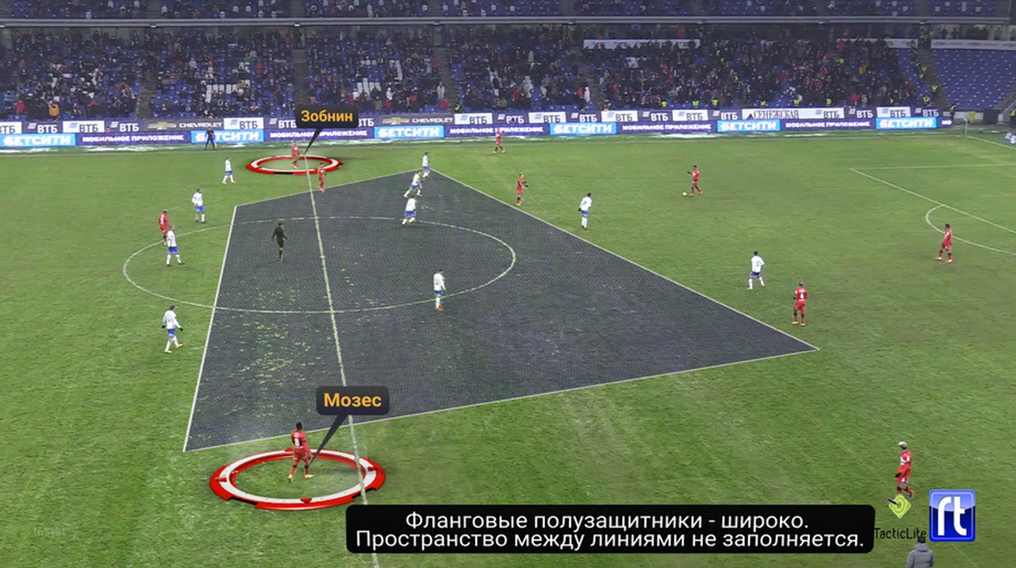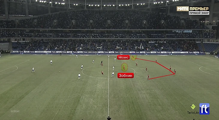 Расположение Мозеса и Зобнина предопределило характер атакующих действий – в них преобладал фланговый акцент. И в начале атаки идеальным вариантом для «Спартака» стала доставка мяча в ширину.