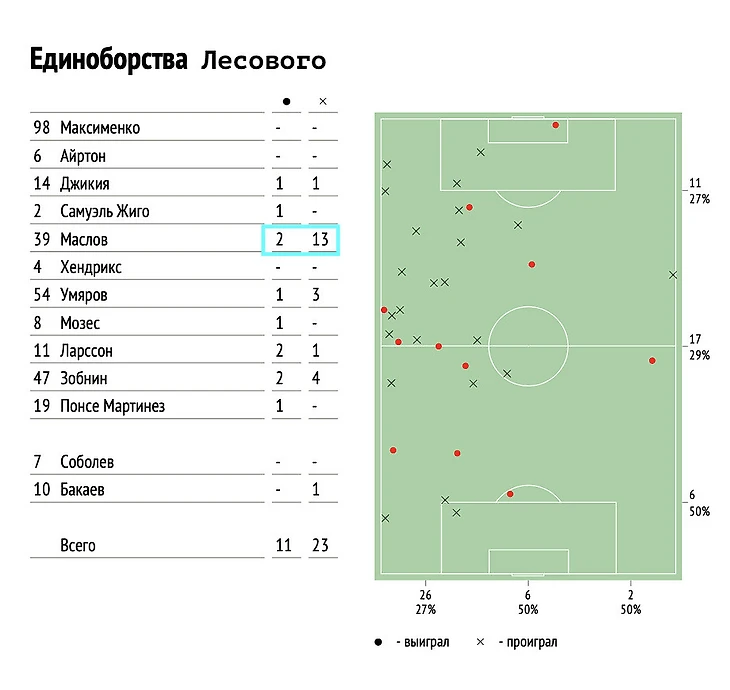 Обратная сторона медали – уверенная игра правого фланга в обороне. Маслов достойно справился с Лесовым и не позволил тому (в отличие от осеннего матча в чемпионате, когда Лесовой терзал Мозеса) много создать. Из 15 единоборств Маслов выиграл у оппонента 13, попутно совершив шесть удачных отборов.