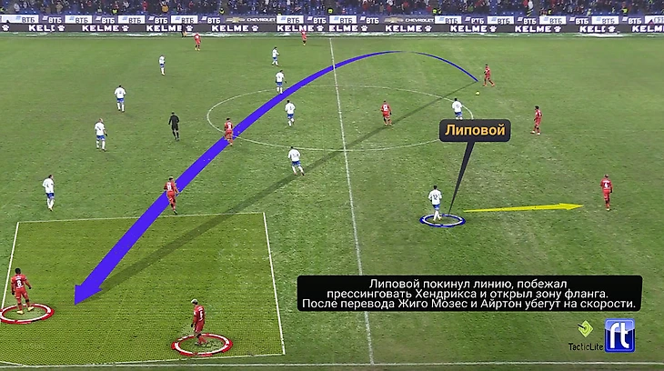 При этом проблемы «Динамо» на фланге были именно системными, особенно проваливался правый полузащитник Липовой. Он постоянно путал ситуации, когда нужно идти в прессинг и когда нужно сохранять компактный блок, раскрывался, убегал давить на Хендрикса и упускал из виду наличие в своей зоне за спиной сразу двух оппонентов, Мозеса и Айртона.