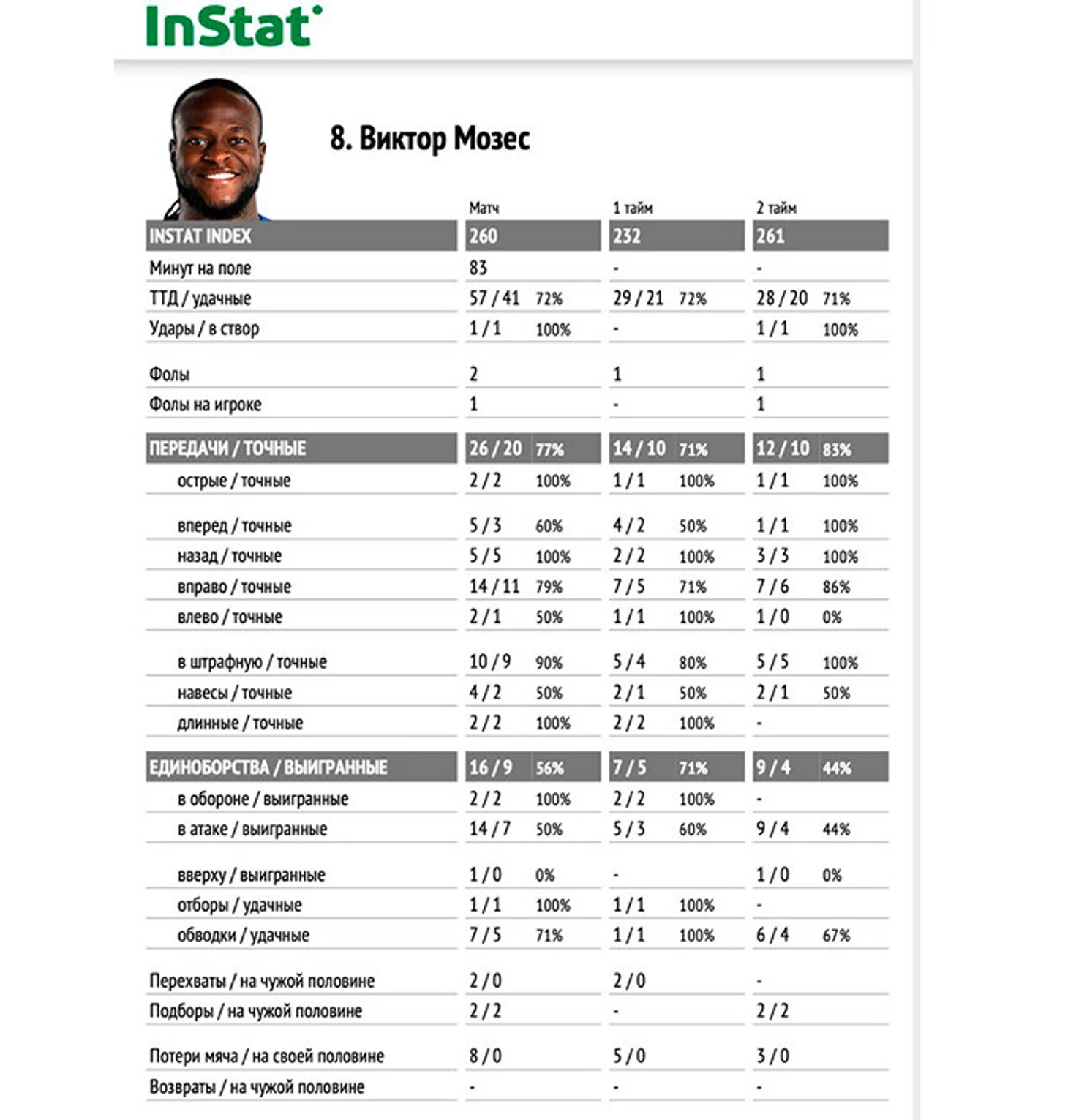 Мозес в первом тайме несколько раз разрывал левый фланг с Айртоном, совершил за игру рекордное в «Спартаке» количество продвижений мяча внутрь штрафной — как на дриблинге (семь попыток, пять удачных), так и за счёт передач (суммарно 10 передач в штрафную и четыре навеса, из них шесть – с игры). Три раза после его прострелов/навесов партнёры били. Да и угловые, которые нигериец сам зарабатывал и сам подавал, хотя бы через раз напоминали адекватные угловые.
