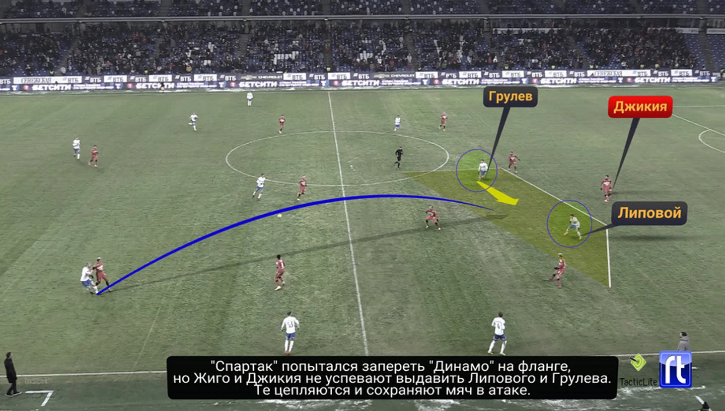 Слабо в таких эпизодах действовали Жиго и Джикия – не соблюдали компактность (ни вертикальную, ни горизонтальную), не успевали встречать Грулёва и Шиманьски в приём, позволяли им разворачиваться или отыгрываться накоротке. «Динамо» цеплялось за мяч, а «Спартак» вообще не вынуждал бело-голубых ошибаться и терять мяч.