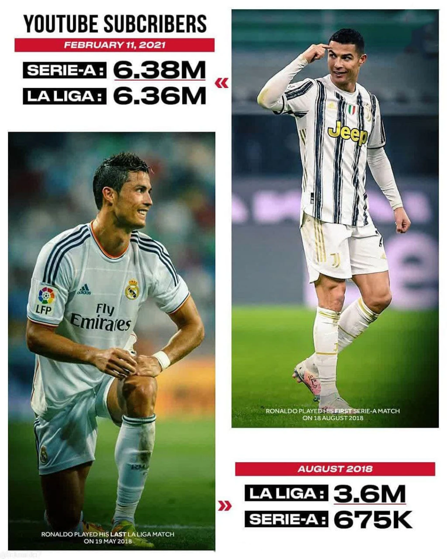 Количество подписчиков в официальных аккаунтах Ла Лиги и Серии А в YouTube, до и после трансфера Роналду