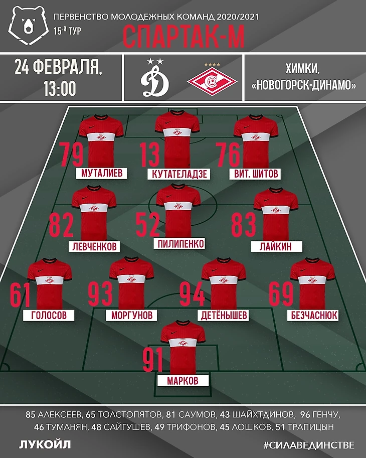 Состав. Молодежка красно-белых усилилась тремя игроками 2003 года рождения из «Спартака-2» — Ильей Детёнышевым, Максимом Лайкиным и Виталием Шитовым. Для Детёнышева и Лайкина это был всего лишь второй выход в стартовом составе на матч молодежного первенства. «Лайкин и Шитов сделали нашу игру более скоростной, — отметил после игры главный тренер молодежки «Спартака» Алексей Лунин. — Ну а для ребят дорогого стоит получить игровую практику в таком матче».