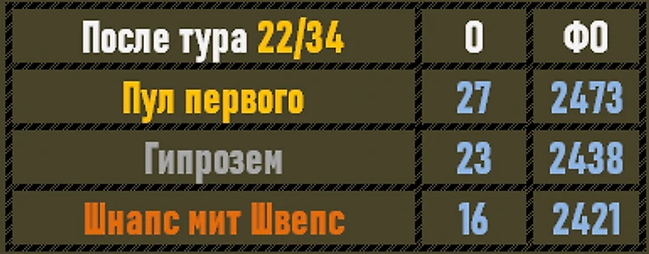 Вот же невезуха для Шнапс мит Швепс! Всего балл проиграли ребята Гипрозему. А вот Пул первого одержали очередную победу благодаря ударному залпу Игоря - блестящие 82 очка!
