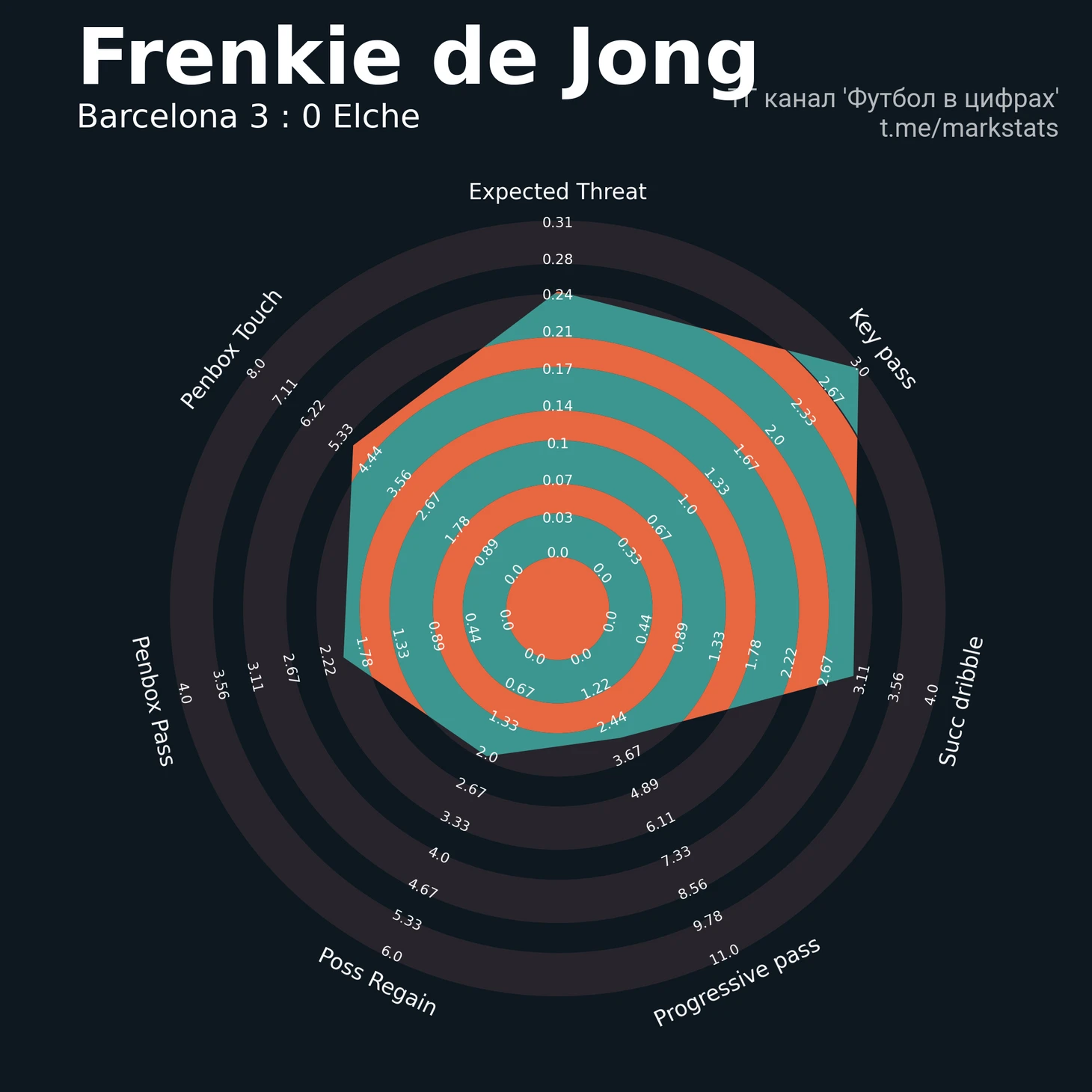Френки тоже один из лучших игроков матча. Тоже большой объем работы, красивейший ассист (не сам пас, а предшествующий ему проход), был лучшим после Месси в продвижении мяча и по хТ и в целом вторым в матче после Лео. В общем, это был типичный классный Френки. 7,9.