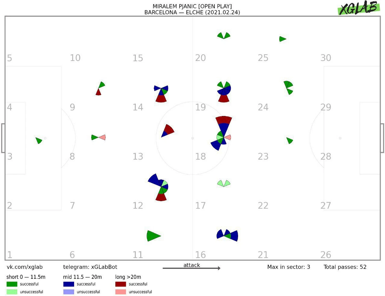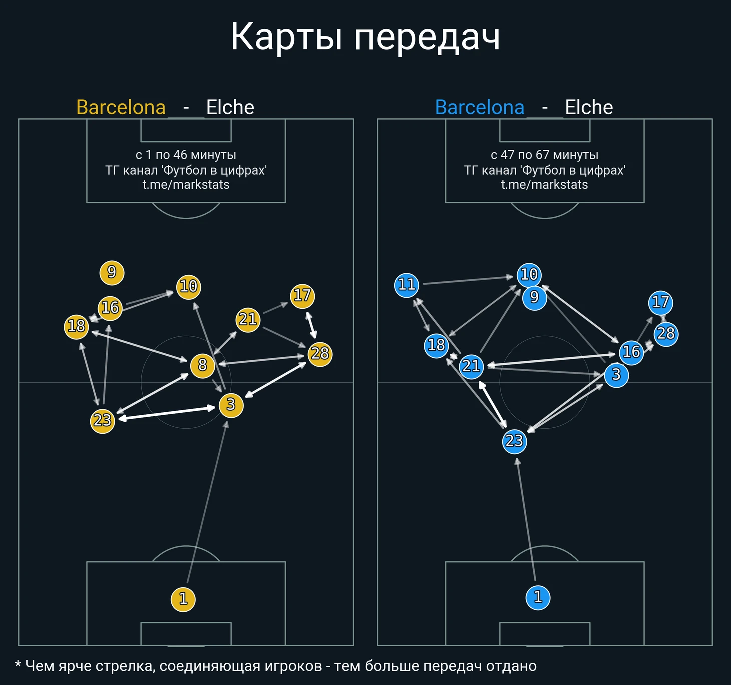 Ну и Брейтуэйт. Вот с ним куда труднее. С одной стороны, Мартин отдал 2 ассиста, с другой — именно качество игры было конечно такое себе. Но если сделать скидку на уровень футболиста, то как для позиции, на которой нужно давать результат, свой результат он сделал. Тем не менее, несмотря на 2 результативных действия, у меня не поднимется рука поставить ему оценку выше, чем у Френки и Педри. Кроме того, Мартин действительно не был вовлечен в игру. Посмотрите карты передач ниже. Датчанин сделал всего 24 касания, отдал лишь 17 передач, а точными оказались и вовсе 10. Может показаться, что автор просто придирается, но мне кажется, в "Барселоне" форвард должен быть именно вовлечен в игру. Если бы не было ассистов — его бы явно худшим игроком матча назвали, но результативные действия меняют многое, поэтому пусть будет 7,7.
